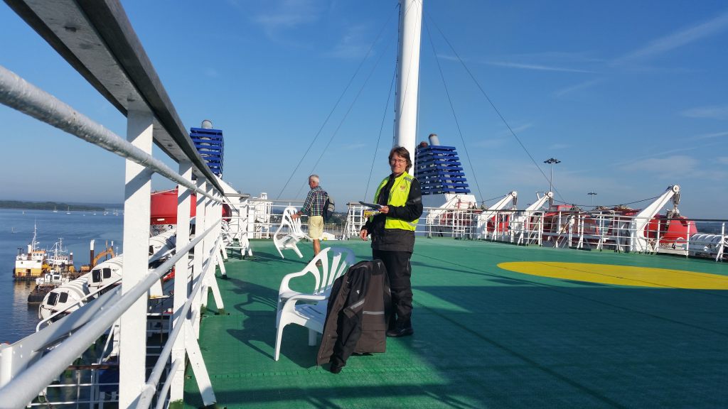 An diesem Dienstagmorgen ging es zurück aufs Festland. Die Abfahrtszeit war um 08.30 Uhr. Das hiess für uns, um 7 Uhr abzufahren. Nach einem kleinen (baustellenbedingten) Umweg trafen wir dann beim Hafen ein. Diesmal wurden wir gründlicher untersucht. Wir wurden mit einem Handscanner gecheckt. Nach kurzer Wartezeit wiesen sie uns dann unseren Parkplatz auf dem Schiff zu. Nochmals einen schnellen Check unseres Handgepäcks, und schon konnten wir das Deck betreten. Wir gehörten zu den ersten Passagieren, die es sich an der Reling bequem machten.