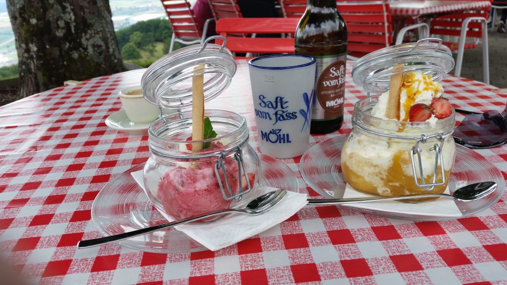 Für diesen Freitag war die Rückkehr nach Hause angesagt. Unser erstes Ziel war Puntrut in der Schweiz. Dort gab es den ersten Kaffeehalt und eine Ortsbesichtigung. Da Trudi noch nie über den Weissensteinpass gefahren war, entschlossen wir uns, diese Richtung einzuschlagen. Auf der Passhöhe genossen wir dann Aussicht und Essen. Das Dessert aber nahmen wir erst im Bergrestaurant Roggen oberhalb Oensingen ein. Es schmeckte gut.